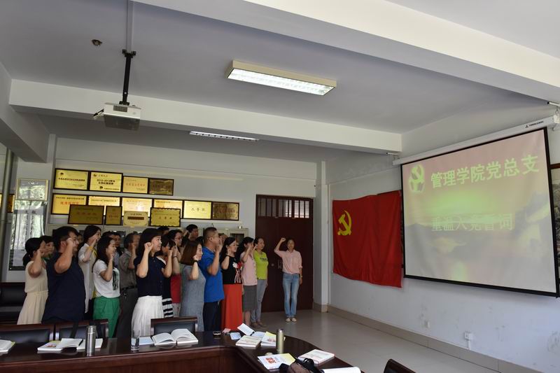 全体党员在教工支部书记徐露的带领下,面对党旗庄严宣誓:“我志愿加入中国共产党,拥护党的纲领,遵守党的章程,履行党员义务,执行党的决定,严守党的纪律,保守党的秘密,对党忠诚,积极工作,为共产主义奋斗终身,随时准备为党和人民牺牲一切,永不叛党。”。当每一名共产党员再次站在鲜红的党旗下,郑重地举起右拳,他们的脸上写满了刚毅,他们的目光再次凝聚,每个人都热血沸腾!